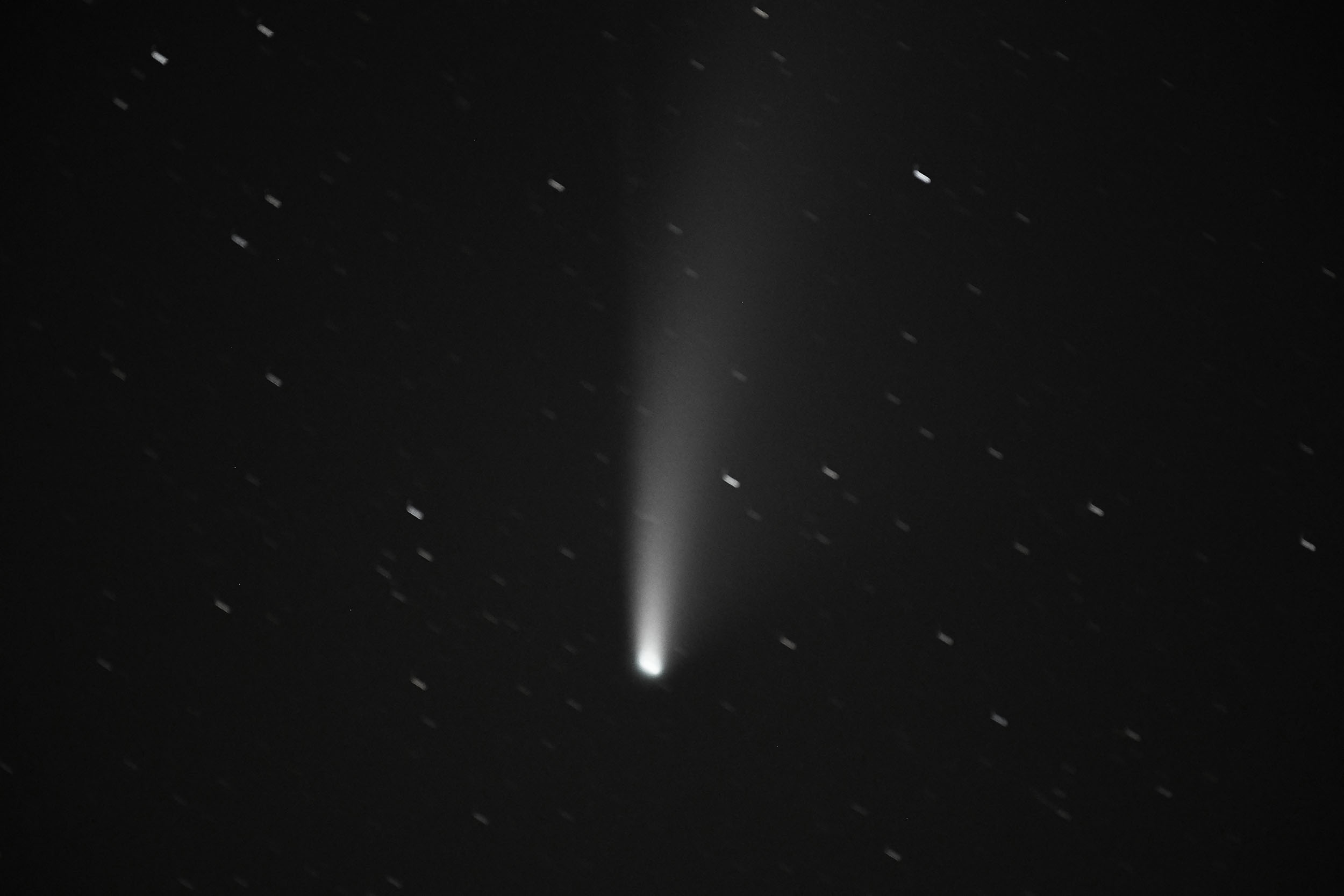 Lorsqu'une comète fait son apparition, elle n'est d'abord pas visible à l'œil nu mais uniquement avec des télescopes. Elle se présente comme une petite tache floue, faiblement lumineuse, comparable à une nébuleuse. Au fur et à mesure de son approche, elle devient de plus en plus lumineuse jusqu'à devenir visible à l'œil nu. À ce moment-là, on voit très nettement le noyau et ses queues. Son éclat continuera d'augmenter jusqu'à ce qu'elle atteigne sa distance la plus proche de la Terre. Les comètes peuvent s'approcher jusqu'à moins de 1 million de kilomètres de la Terre. Elles se déplacent très rapidement mais, du fait de leur distance il faut plusieurs nuits d'observation pour se rendre compte de leur déplacement. En effet, si vous vous placez à 100 mètres d'une voie ferrée et que vous observez un train passant devant vous à 100 km/h, vous allez le voir passer très vite. Placez-vous maintenant à deux kilomètres de la voie et observez le même train. Il vous semblera que le train roule beaucoup moins vite. Il n'en est rien. C'est la distance par rapport à la voie qui vous donnera cette impression. Il en est de même dans l'espace.